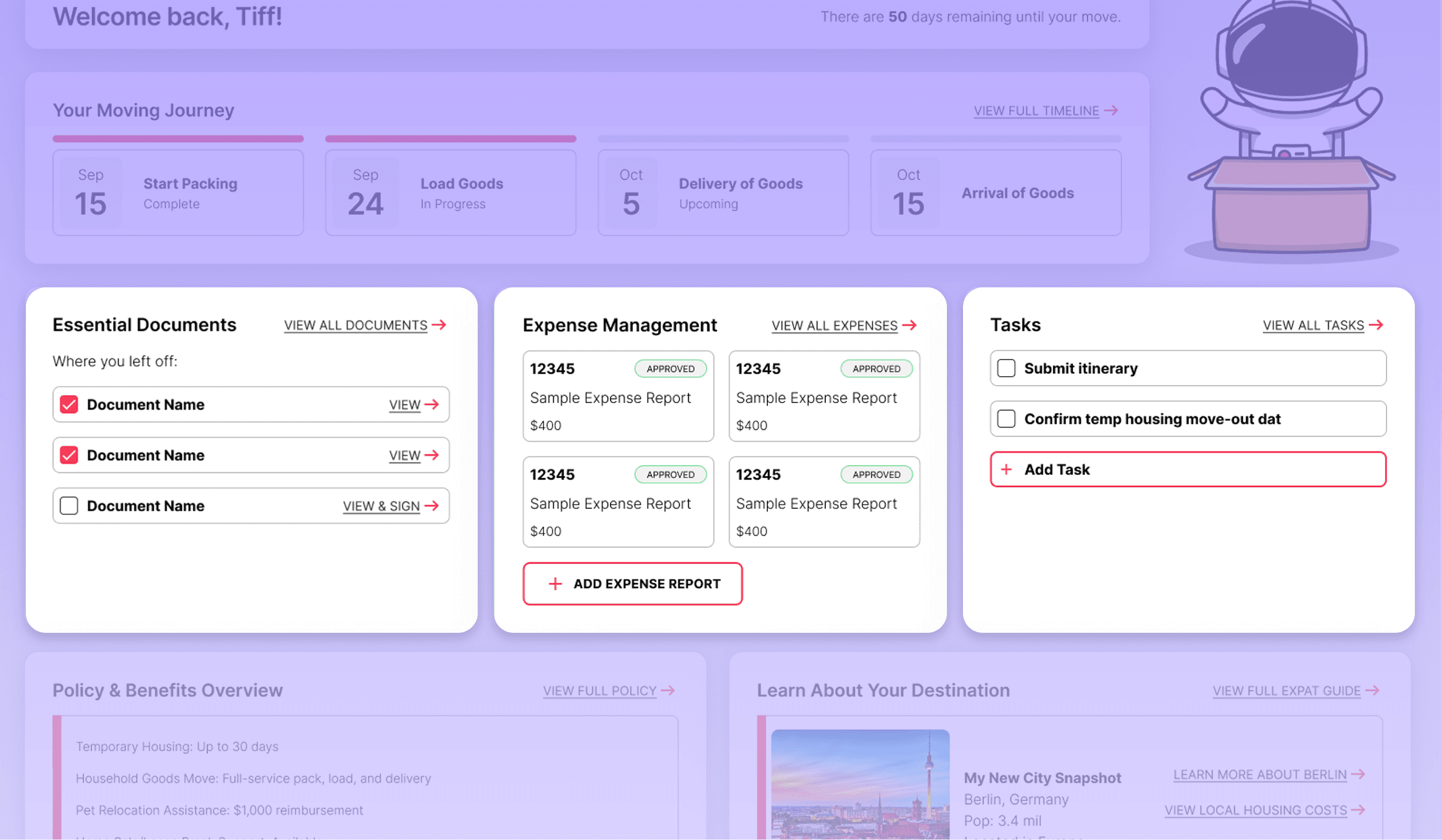 I designed a dashboard where users could get an overview of their relocation process, with helpful shortcuts to essential documents, expenses, and their task list.