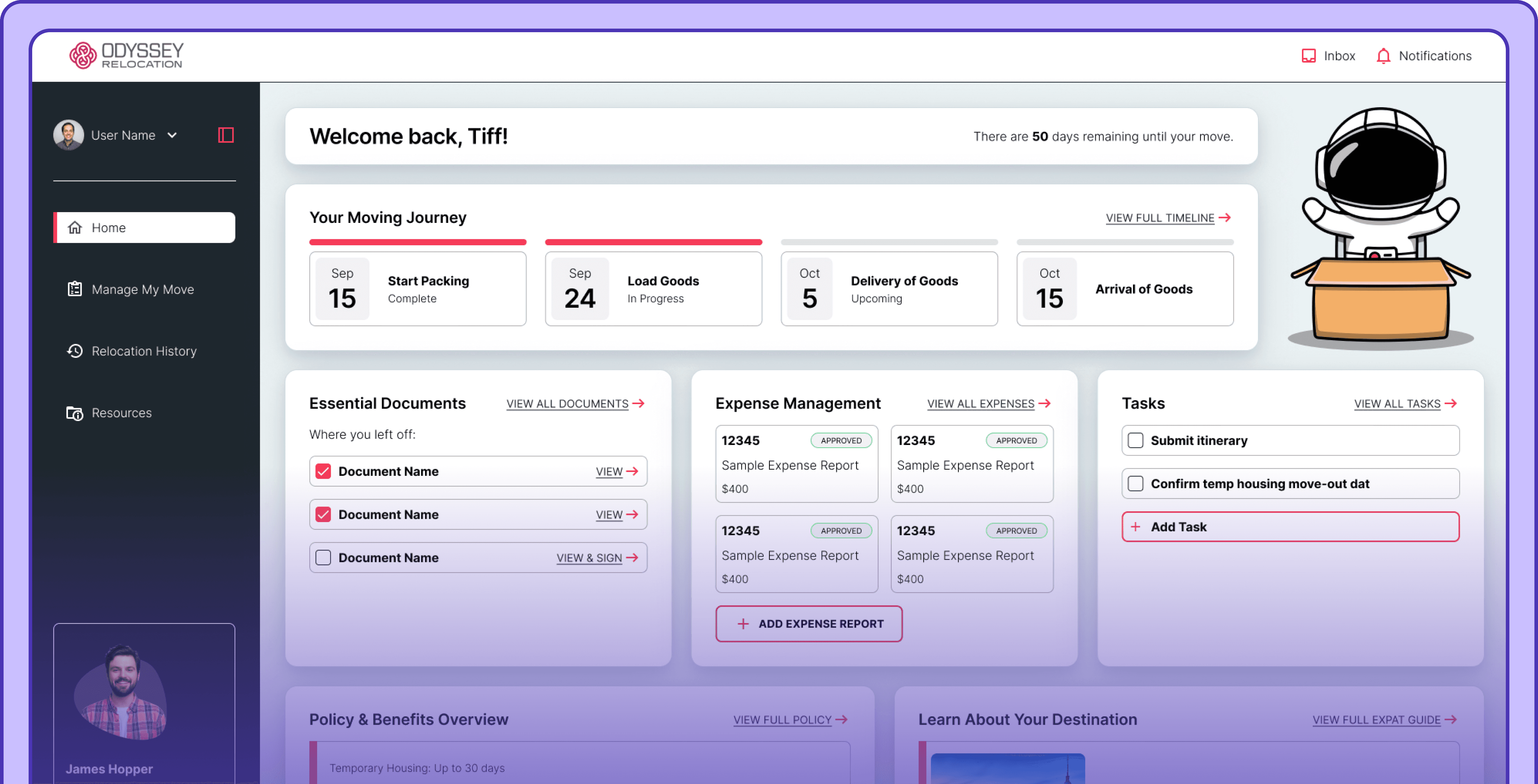 Odyssey Relocation's outdated client portal was making it harder than it should be for users to navigate their relocation journeys, and harder for the sales team to confidently showcase the product to potential clients. With an outdated interface, confusing navigation, and inconsistent user flows, the portal didn’t reflect the quality of service Odyssey provides. I partnered directly with leadership to redesign the experience from the ground up, modernizing the UI, improving usability, and creating a system they can proudly stand behind.